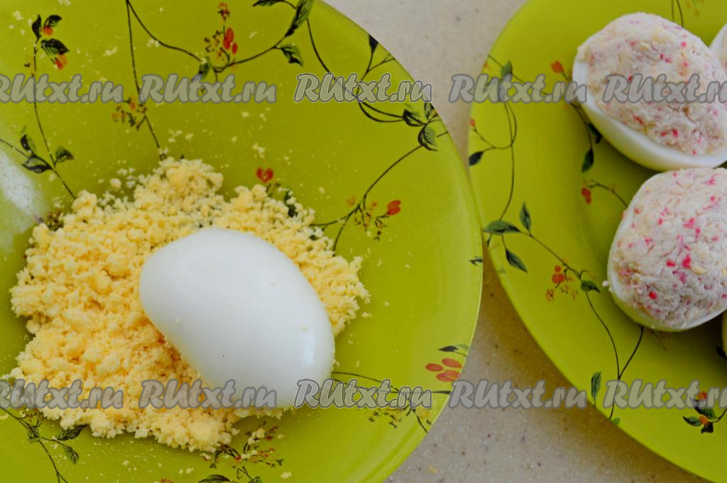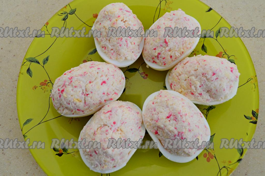 Наполнить крабово-сырной массой половинки яичных белков. Начинки не жалеем, распределяем её горочкой сверху.
