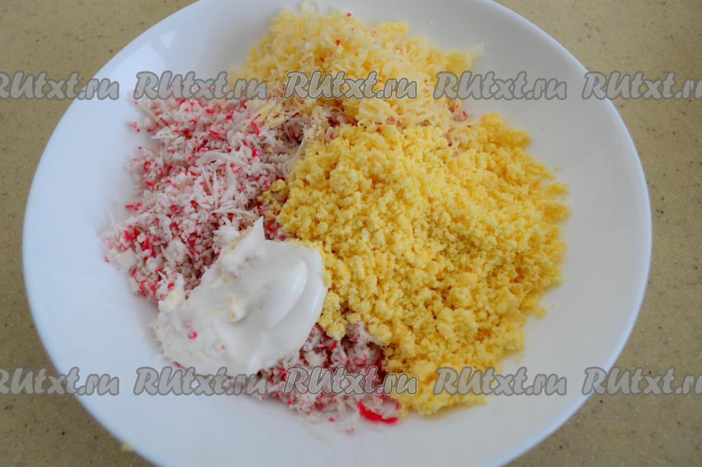 В тарелку с крабовыми палочками и желтками добавить сыр, натёртый на мелкой тёрке, сюда же выложить майонез, перемешать, немного подсолить (учитывая степень солёности сыра).