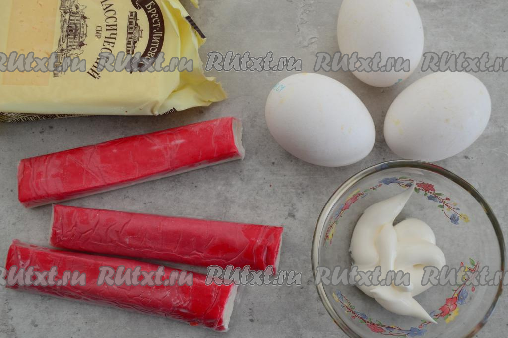 Подготовить продукты. Отварить яйца в течение 10 минут после закипания воды, после этого залить их очень холодной водой и оставить остывать. После остывания очистить. Крабовые палочки заранее достать из морозилки, чтобы они слегка разморозились (полностью размораживать их не нужно, тогда они легче будут в дальнейшем натираться на тёрке). Для приготовления этой закуски подойдёт любой сыр твёрдых сортов, можно взять и плавленый сырок типа "Дружба".