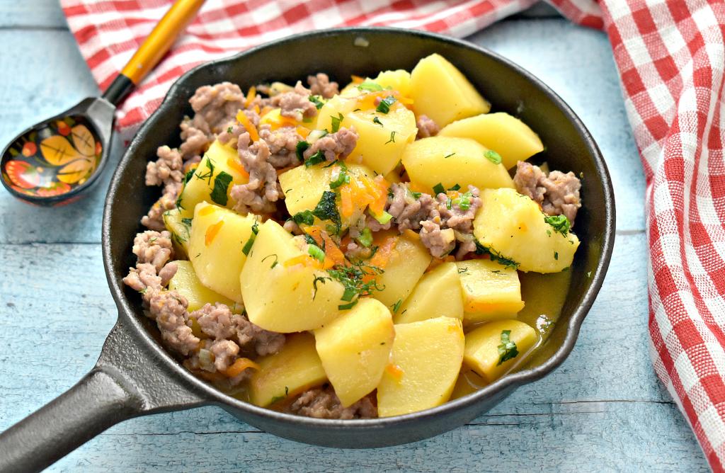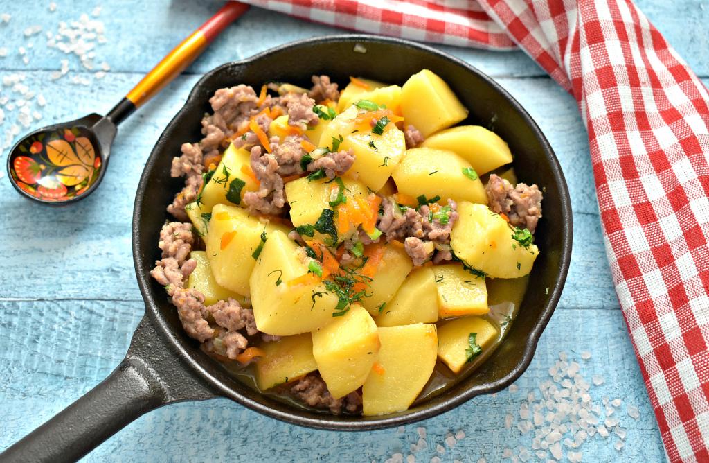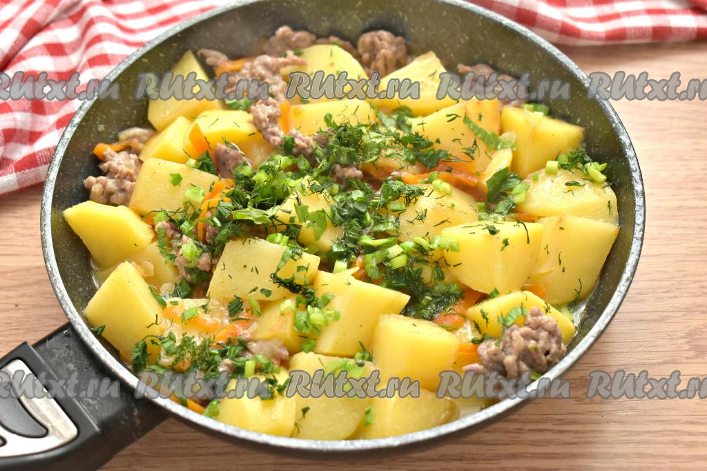 Картошка, тушёная с фаршем на сковороде