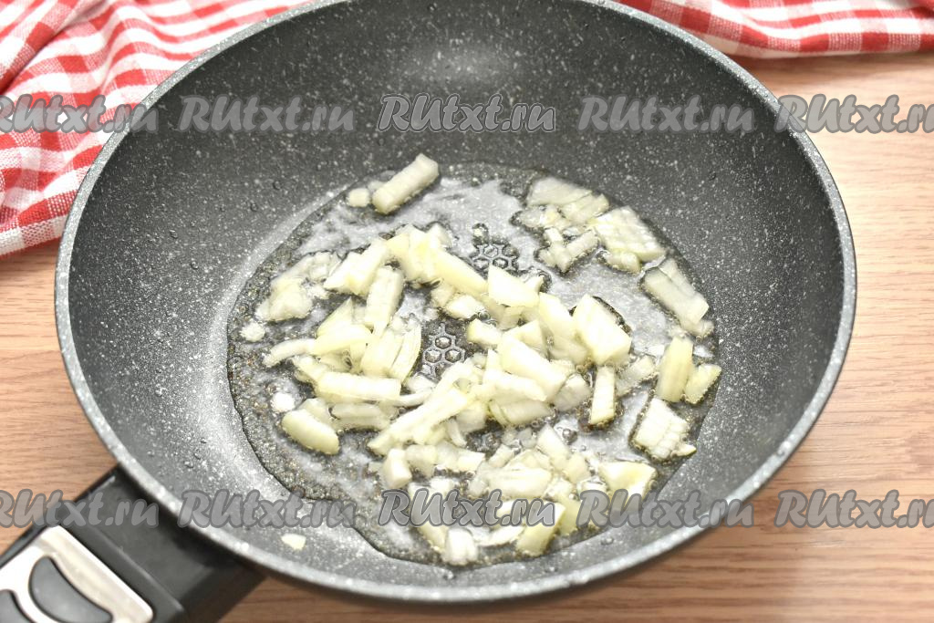 Морковку и лук очищаем. Убавляем нагрев плиты до среднего, добавляем, при необходимости, ещё 1 столовую ложку масла на сковороду. Выкладываем лук, нарезанный на небольшие кубики, и обжариваем его, иногда перемешивая, 2 минуты.
