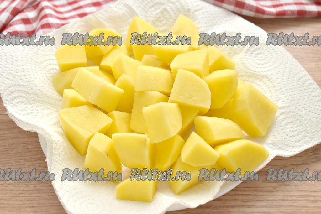 Картошку очищаем, промываем, нарезаем на достаточно крупные кусочки, выкладываем на бумажные полотенца и обсушиваем.