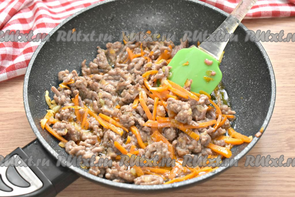К морковке и луку выкладываем мясной фарш.