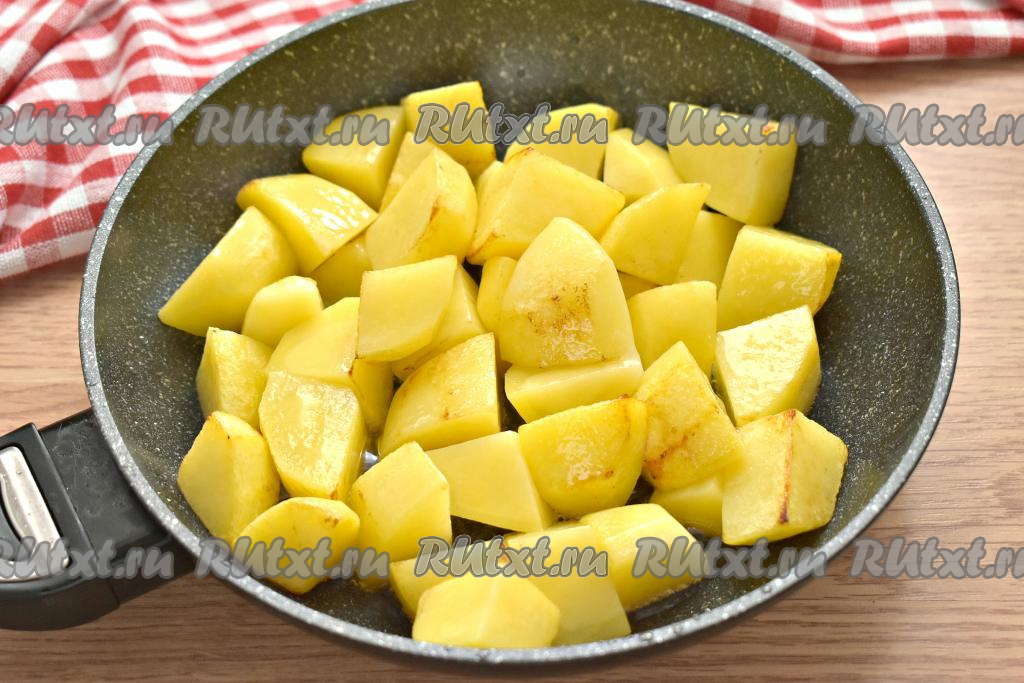После этого на сковороду добавляем обжаренные кусочки картошки, по вкусу солим, перчим. Можно использовать свои любимые специи или приправы.