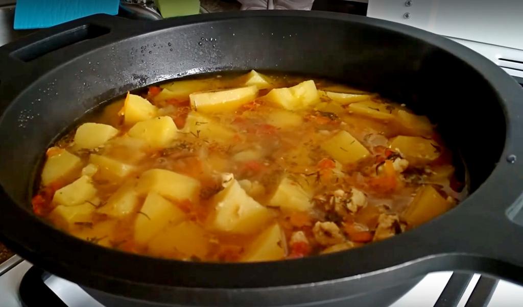 Содержимое сковороды заливаем тёплой кипячёной водой так, чтобы она покрыла картошку не полностью (выше середины).
