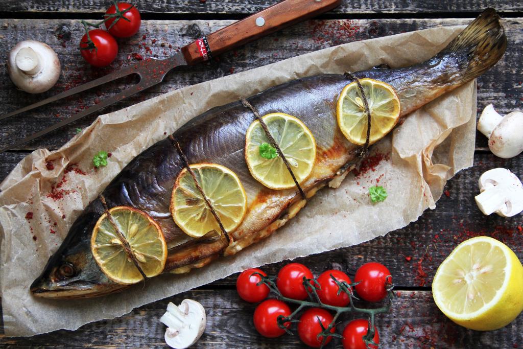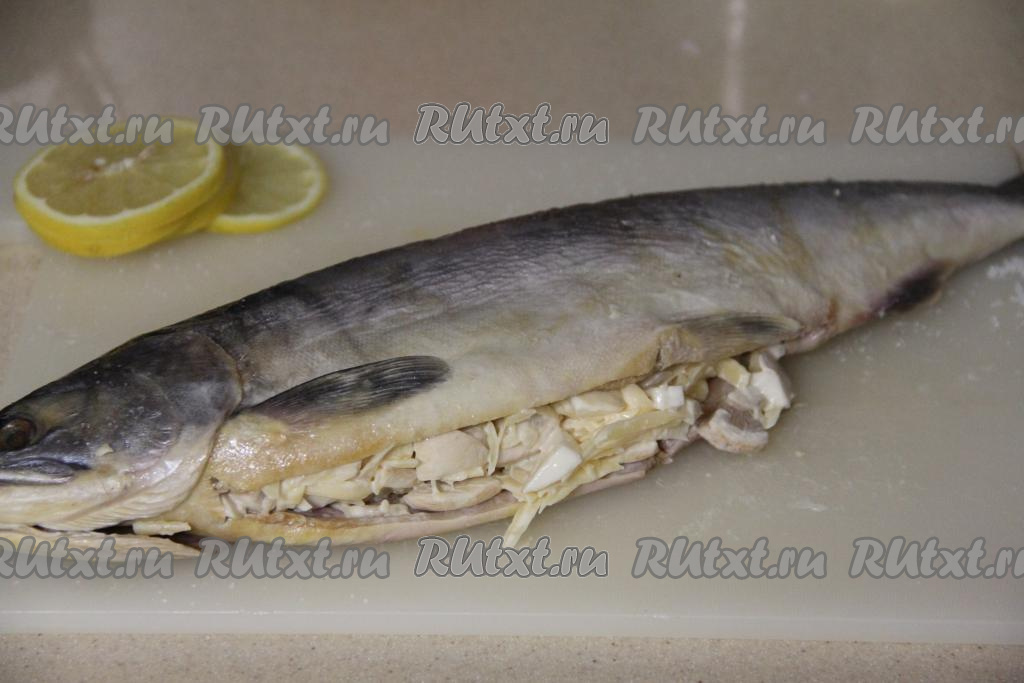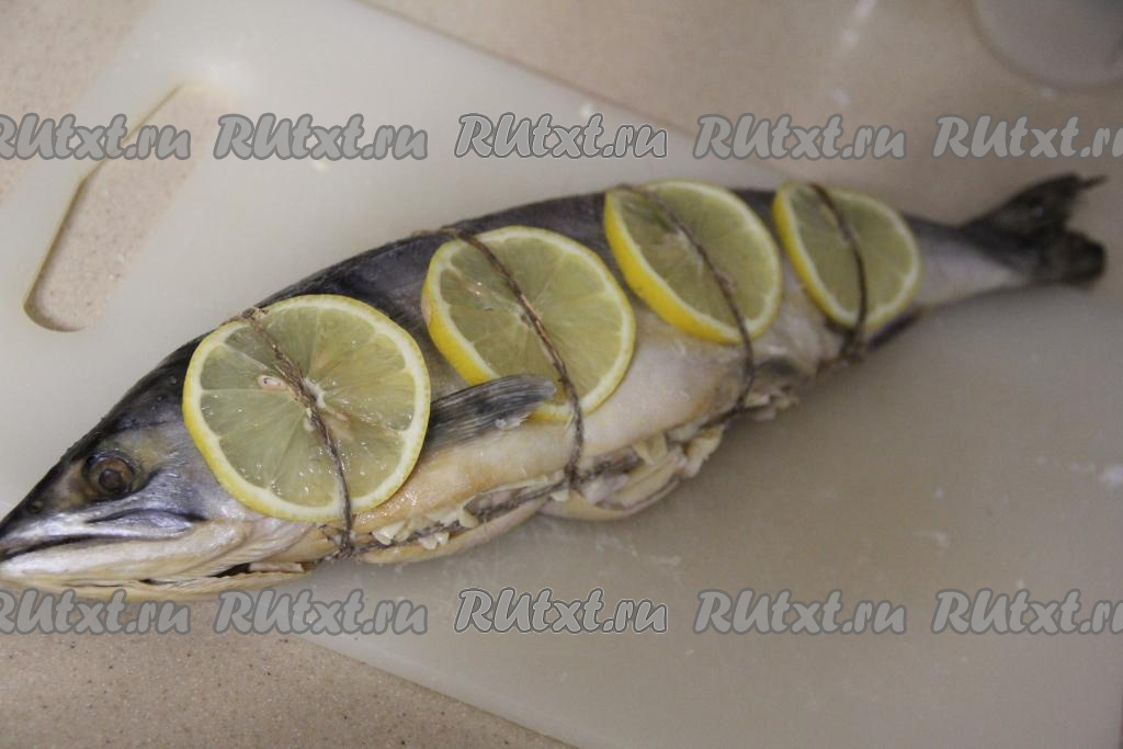 Выложить кружочки лимона поверх рыбки. Скрепить тушку с начинкой с помощью бечёвки (или нитки).