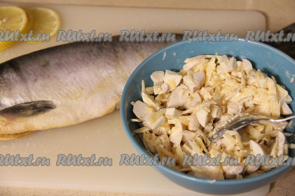 Рыбку натереть со всех сторон солью. Наполнить брюшко горбуши начинкой из шампиньонов и сыра.