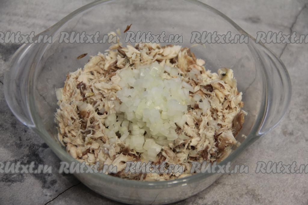 Почистить и мелко нарезать маленькую луковицу, добавить к скумбрии.