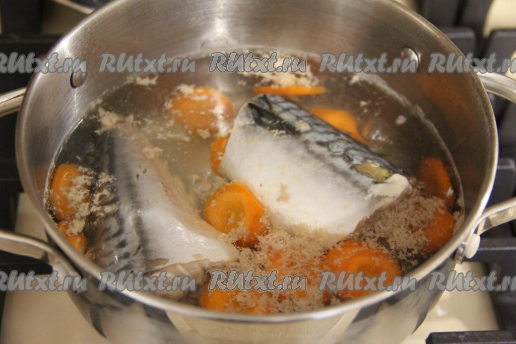 Залить скумбрию полностью водой и поставить на огонь. Варить рыбку с момента закипания 10-15 минут (до мягкости морковки).