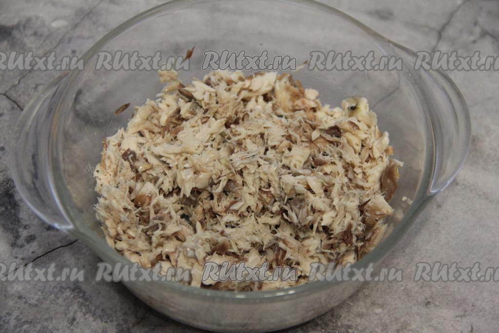 Готовую рыбу полностью остудить в бульоне. Затем достать скумбрию из бульона и отделить филе от костей. Филе скумбрии размять вилкой, переложить в миску.