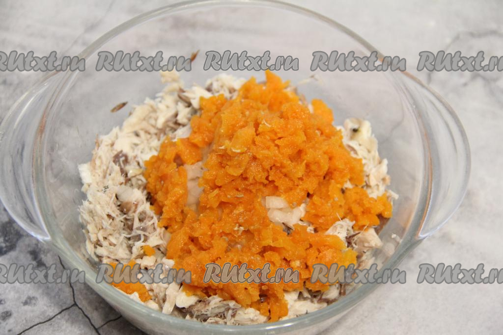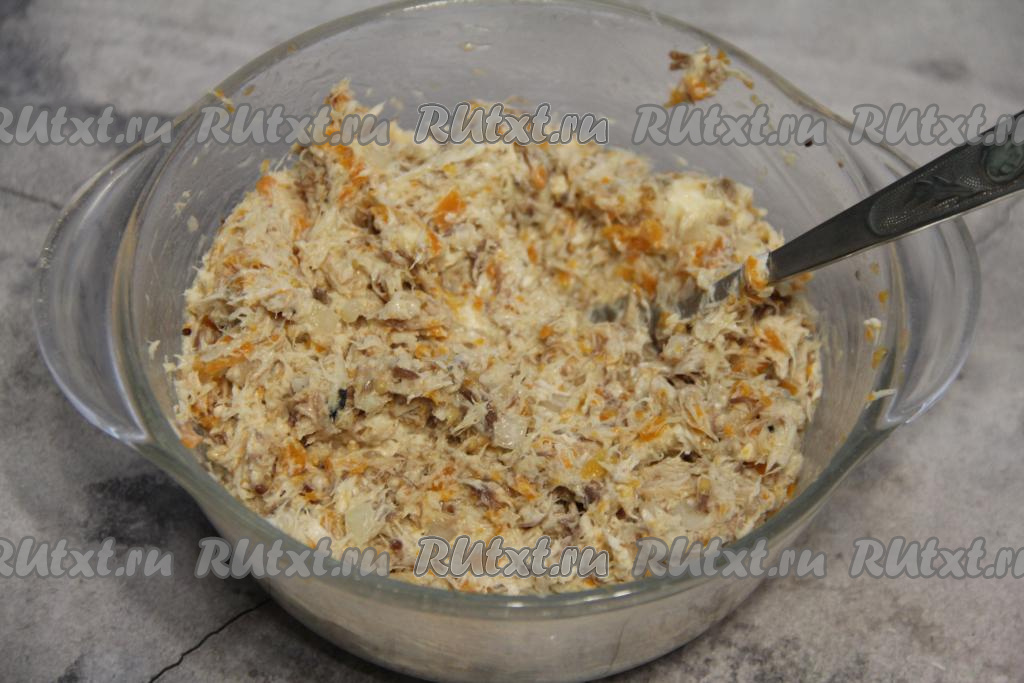 Морковку достать из бульона, размять вилкой и переложить к рыбе с луком.