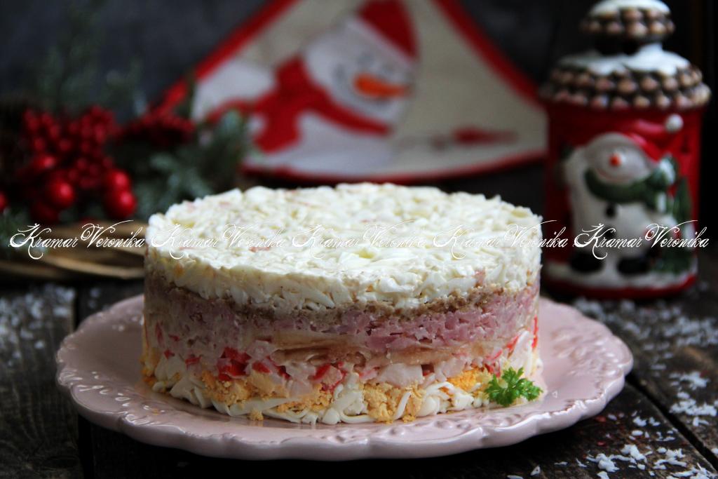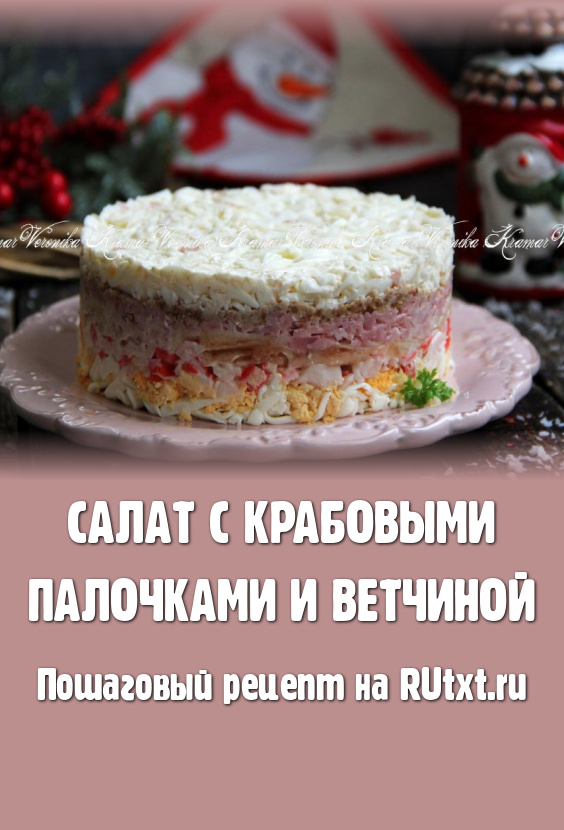 Затем снять бортики и подать блюдо к столу. Салат, приготовленный с крабовыми палочками и ветчиной, получается вкусным, красивым и достаточно сытным, он отлично будет смотреться на любом праздничном застолье!