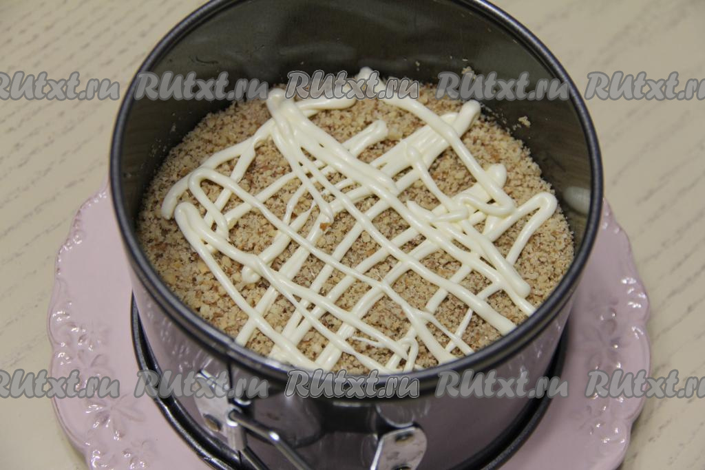 Грецкие орехи измельчить, распределить их поверх ветчины, покрыть сеточкой из майонеза.