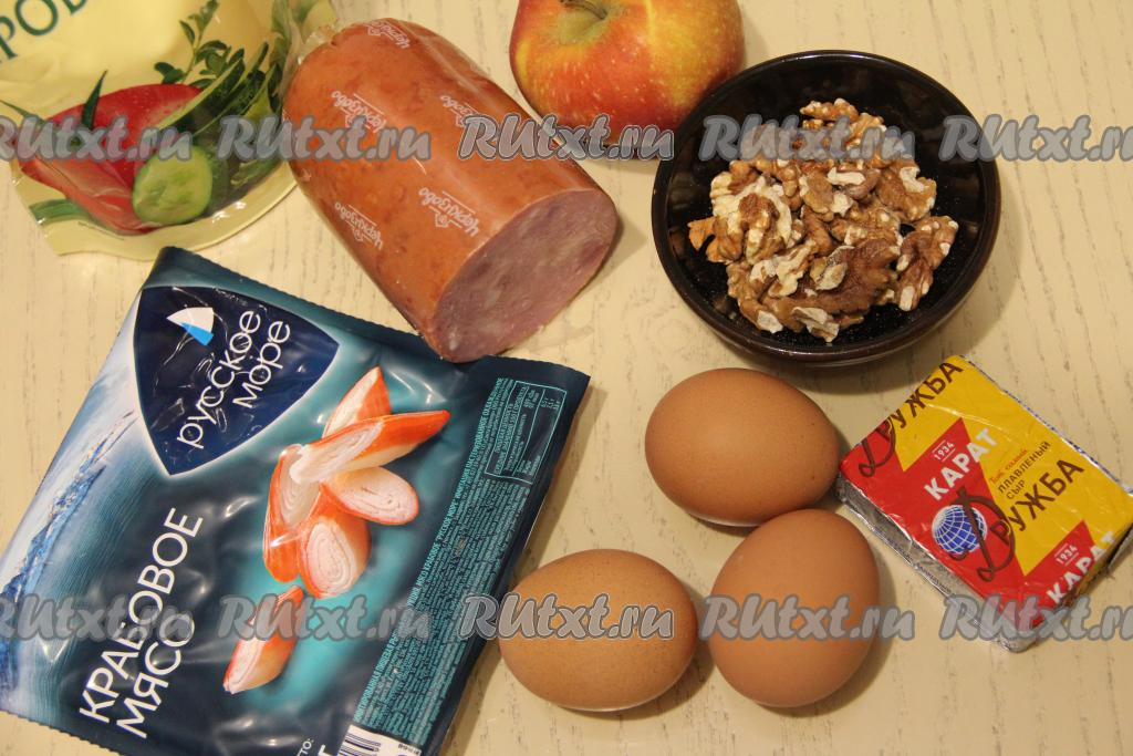 Предлагаю к праздничному столу приготовить очень вкусный, аппетитный салат с крабовыми палочками и ветчиной. Выкладывается этот салат слоями. Особую пикантность ему придаёт кислое яблоко, входящий в его состав, и грецкие орехи. Готовится он несложно, а получается интересным и внешне, и на вкус. Уверена, этот салат украсит любое торжество!