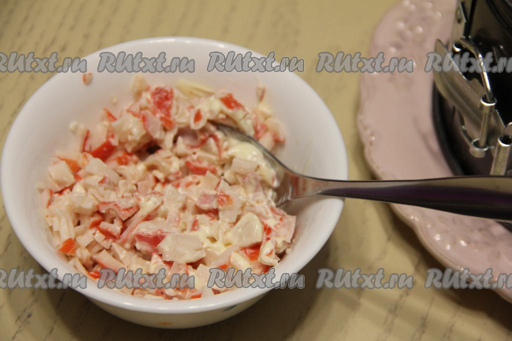 Крабовые палочки мелко нарезать, добавить к ним немного майонеза и перемешать.