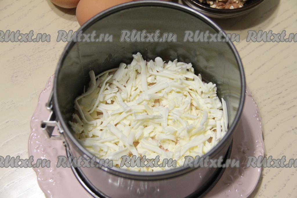 Этот салат нужно формировать слоями. Я формировала его с помощью металлического формовочного кольца диаметром 18 сантиметров, можно просто выложить слои в глубоком салатнике. Кольцо поставить на плоскую тарелку. Сырок натереть на тёрке и выложить первым слоем.
