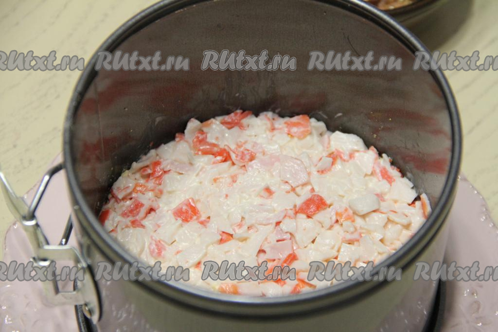 Поверх желтков выложить слой крабовой массы, разровнять и утрамбовать.