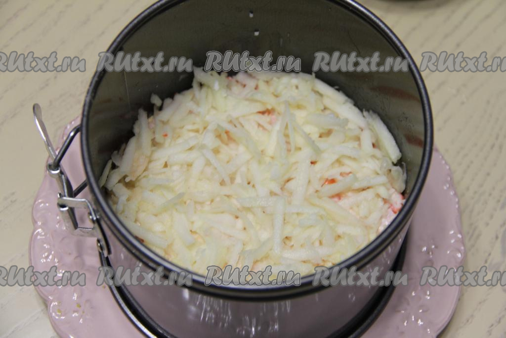 Кислое яблочко, очищенное от кожуры и косточек, натереть на крупной тёрке и равномерно распределить поверх крабовой массы, утрамбовать.
