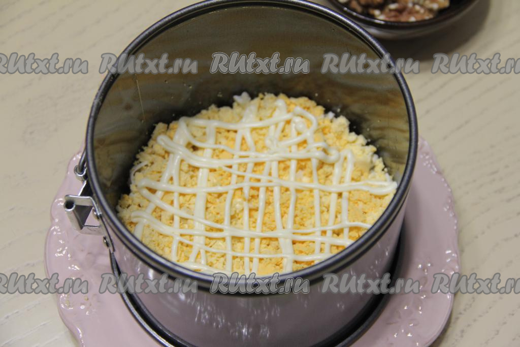 Яйца почистить, разделить на белки и желтки. Раскрошить желтки и выложить равномерно поверх сыра. Нанести решётку из майонеза и слегка утрамбовать слои.