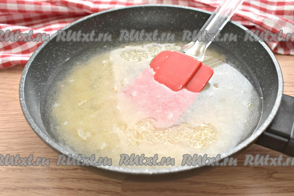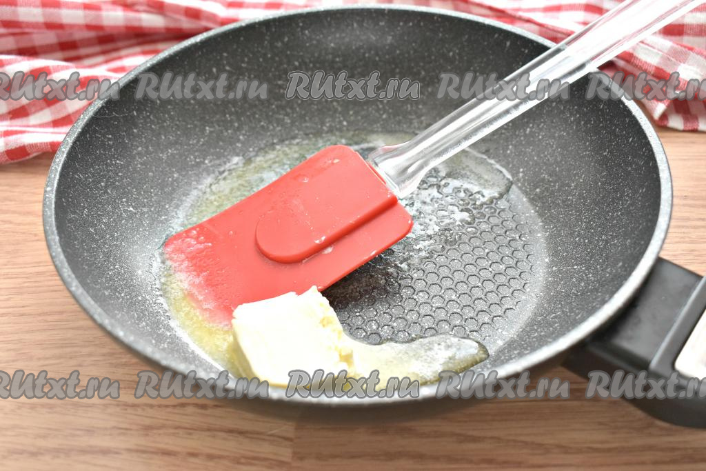 На сковороду кладём кусочек сливочного масла и полностью его растапливаем на умеренном огне.