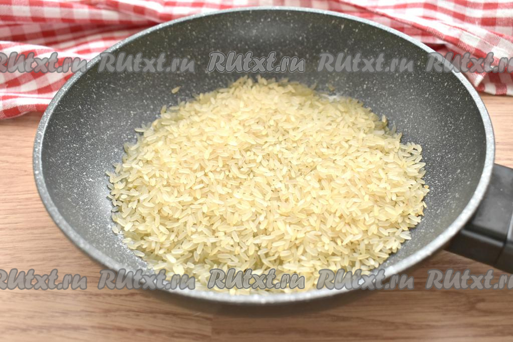 Всыпаем на сковороду пропаренный рис, разравниваем его.