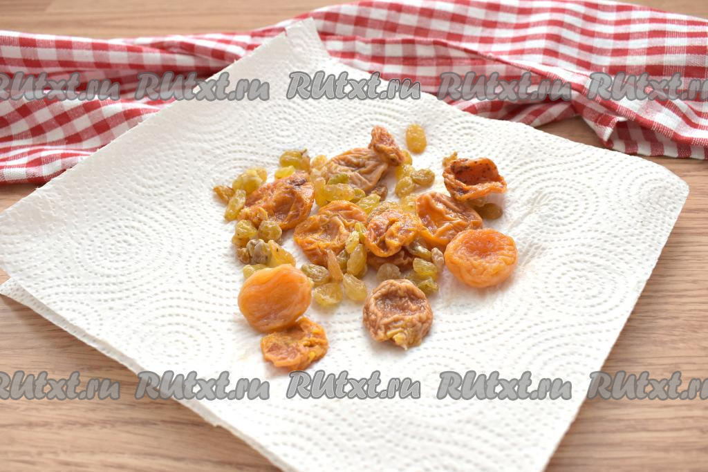 Добавляем изюм и нарезанную на кусочки курагу, перемешиваем.