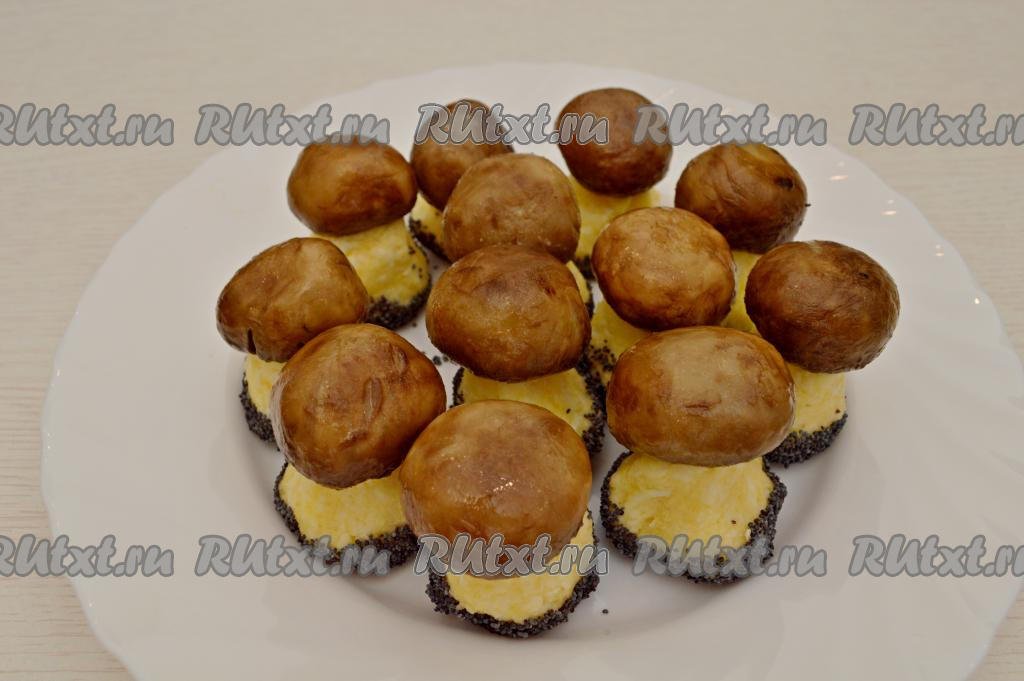 Сверху надеть шляпки грибов, немного прижав. Всего у меня вышло 12 грибочков. Грибы хорошо держат форму, устойчиво стоят на тарелке.