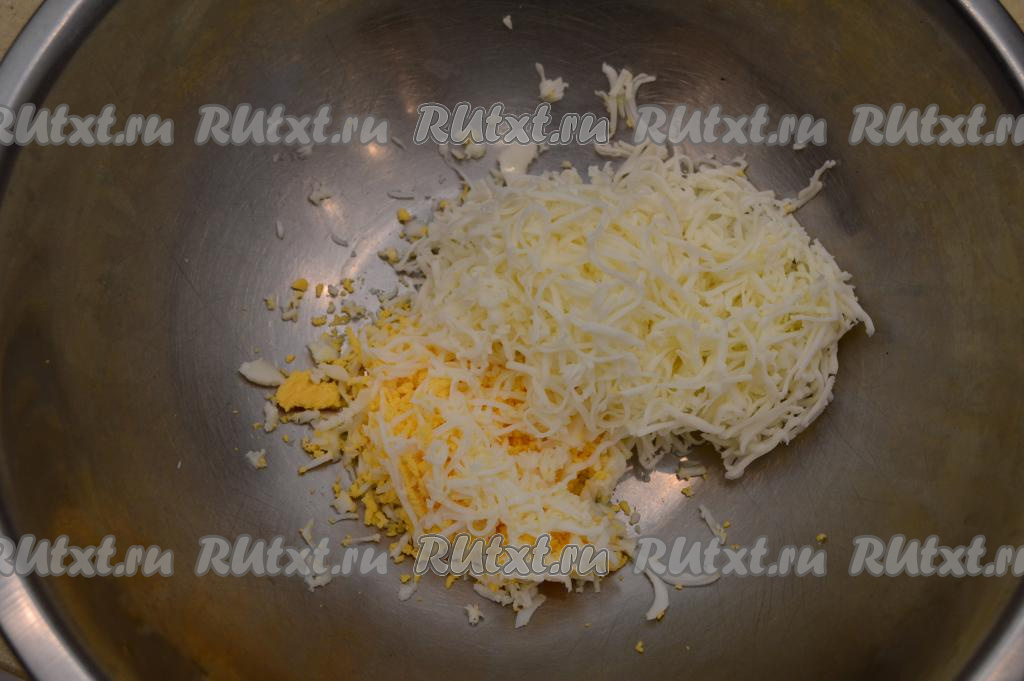 В глубокую миску натереть на мелкой тёрке яйцо и плавленный сырок.