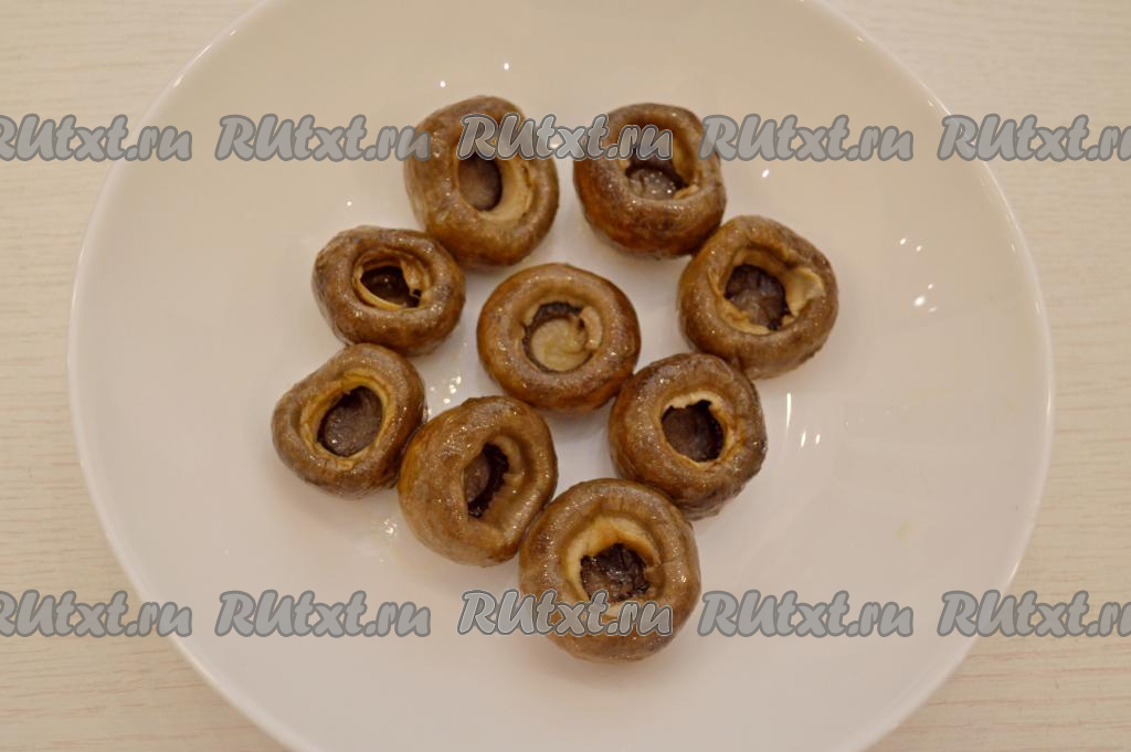 Взять маринованные шампиньоны. Я взяла шампиньоны, замаринованные в домашних условиях. От маринованных шампиньонов отделить ножки (ножки для этого рецепта нам не понадобятся). Грибочки лучше брать среднего размера с диаметром шляпки 2-4 сантиметра.