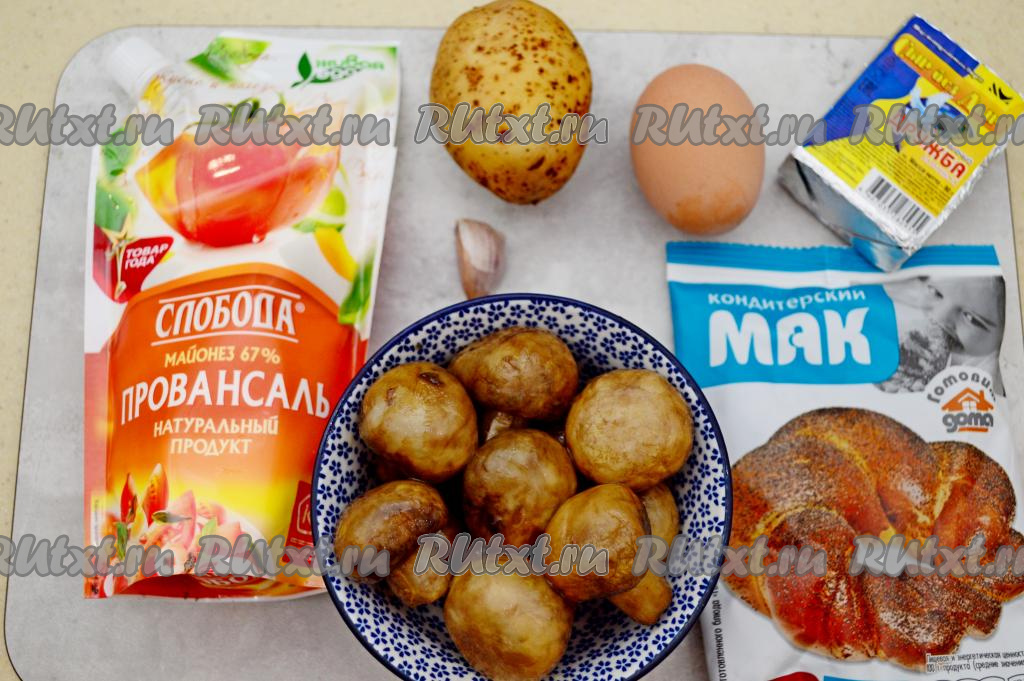 Подготовить продукты. Сварить вкрутую яйцо (варить после начала кипения воды минут 9-10). Картофель вымыть и сварить в кожуре до готовности (в течение 20-25 минут с момента закипания воды). Сваренные яйцо и картошку полностью остудить, а непосредственно перед началом формирования закуски их нужно будет очистить.