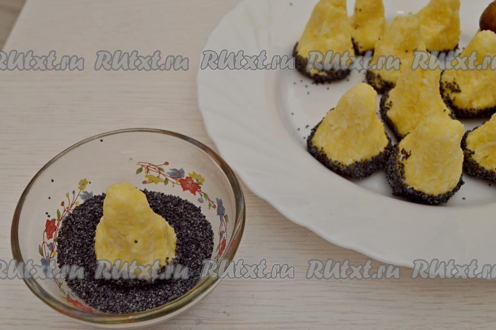 В отдельную мисочку насыпать мак (вместо мака можно взять чёрный кунжут). Влажными руками из массы сформировать конусообразную заготовку ножки гриба. Основание ножки должно быть плоским, чтобы грибочек в дальнейшем устойчиво стоял на тарелке. Основание ножки гриба обвалять в маке и поставить на блюдо для подачи. Таким же образом сформировать все заготовки.