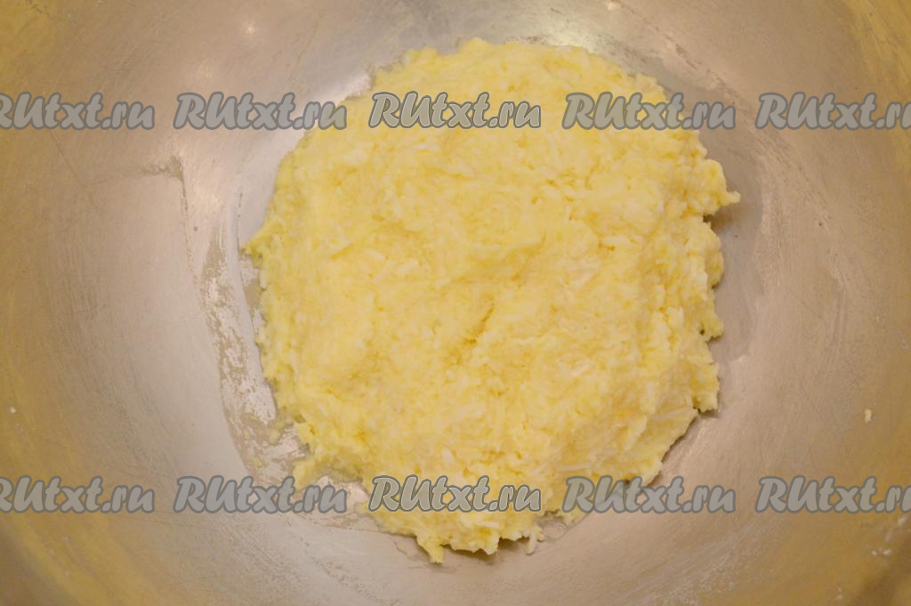 К яйцам, картошке, чесноку и сыру добавить майонез и соль, перемешать до однородности. Картофельно-сырная масса должна получиться достаточно пластичной и держать форму, слишком сухой она быть не должна (если нужно, добавьте немного майонеза, но и лишнего майонеза добавлять не надо, чтобы масса не была мокрой).