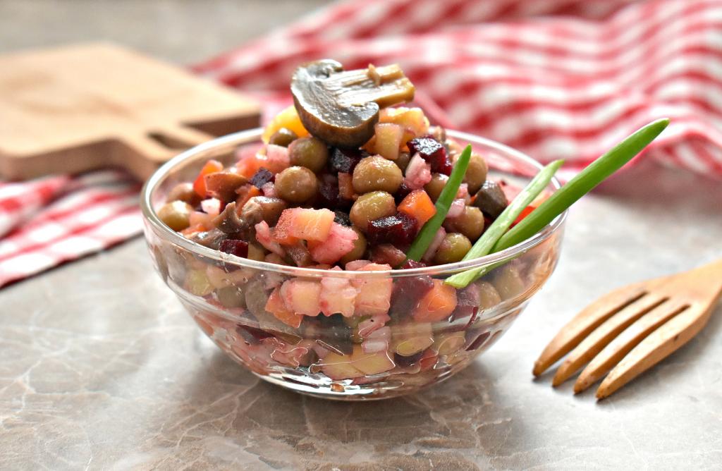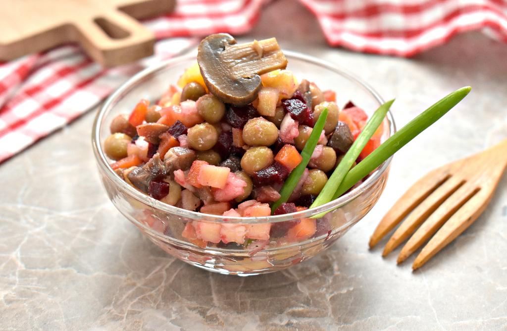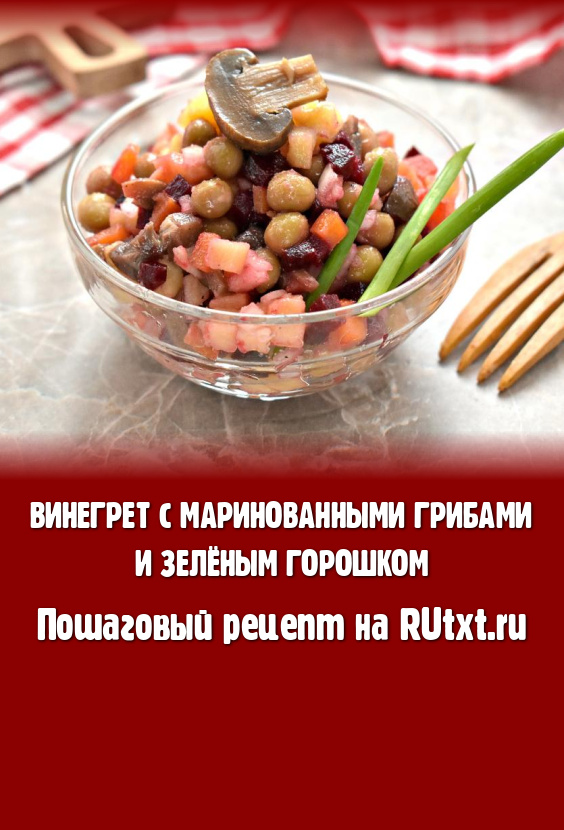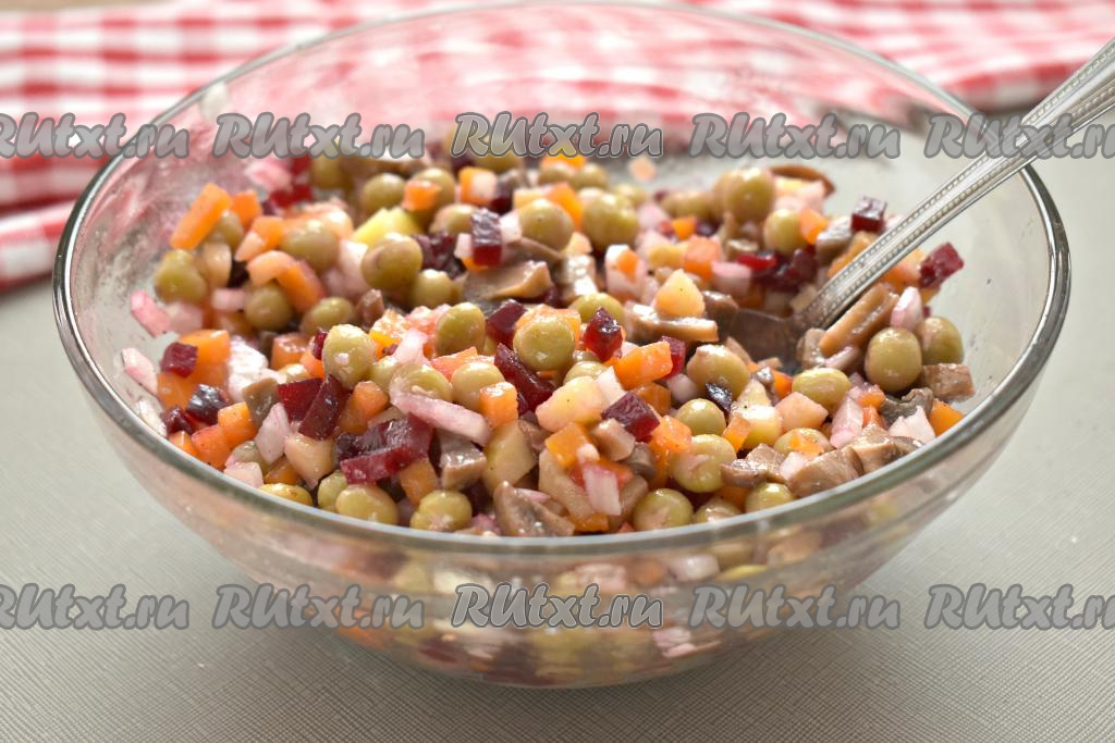 Чаще всего основными продуктами для винегрета являются морковка, свекла и картошка. В этот раз предлагаю разнообразить это блюдо и к основным ингредиентам добавить грибы и горошек. Винегрет, приготовленный с маринованными грибами и зелёным горошком без добавления квашеной капусты, получается сытным, аппетитным и вкусным. Грибочки придают этому салату пикантную нотку, а горошек делает его более ярким и насыщенным. Такой винегрет можно приготовить и в будний день, и для праздничного застолья.