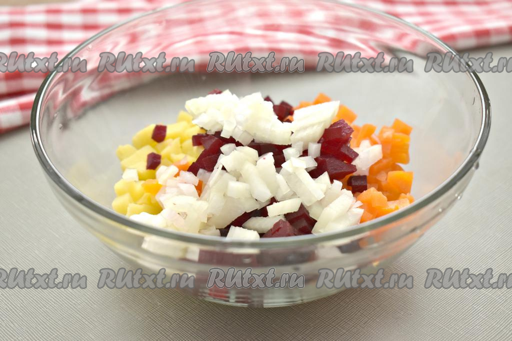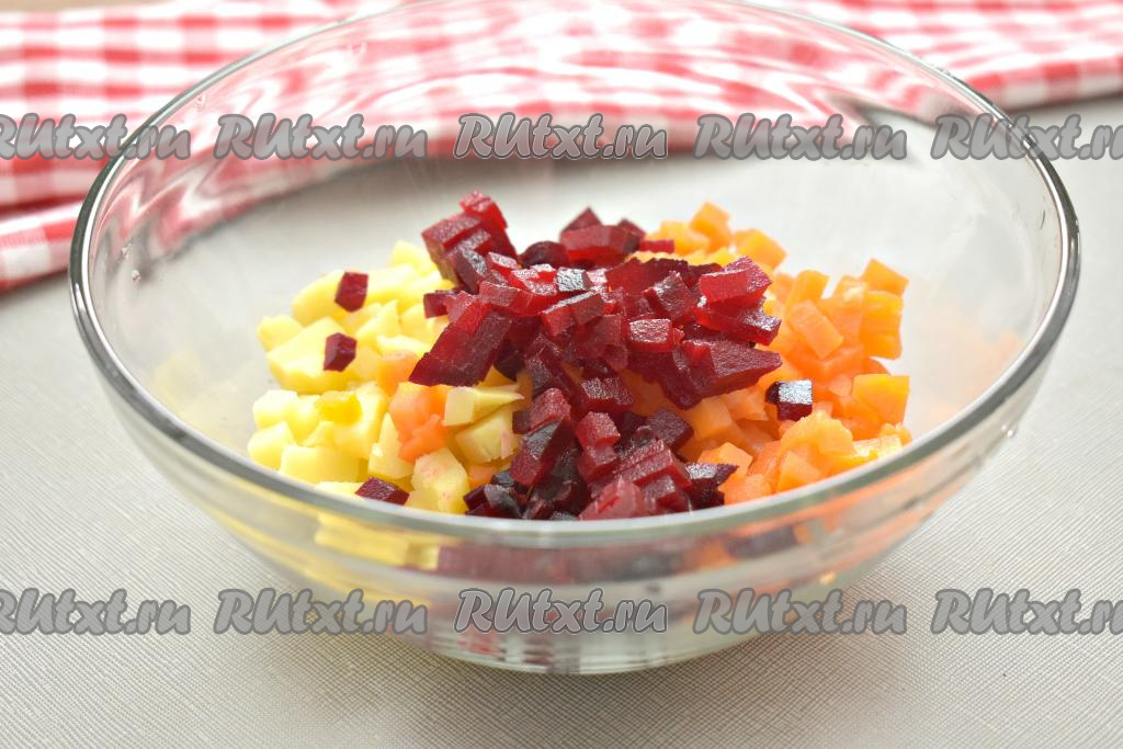 Варёную свеклу тоже нарезаем на маленькие кубики, перекладываем в миску с морковью и картофелем. Стараемся нарезать отваренные овощи одинаково, чтобы готовый винегрет выглядел красиво и аппетитно.