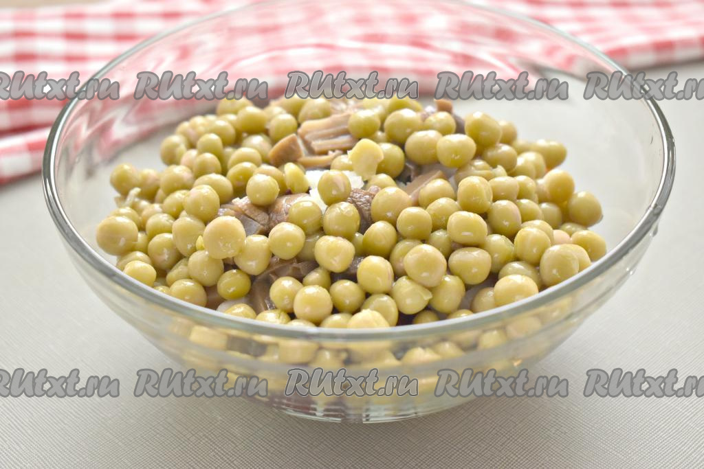 Винегрет с зелёным горошком и маринованными грибами заправляем растительным маслом, солим и перчим.