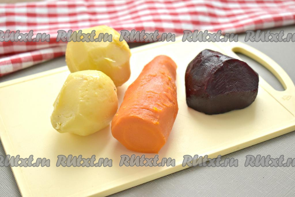 Промываем под проточной водой картошку, свеклу и морковь, очищать корнеплоды не нужно. Картошку отвариваем с момента закипания воды в течение 20 минут, морковку - 25-30 минут, свеклу – 40-45 минут (я отвариваю свеклу отдельно, чтобы она в процессе варки не окрасила картошку с морковью). Готовые овощи будут легко прокалываться ножом. Варёные овощи ставим под холодную воду, остужаем, а затем очищаем и сразу начинаем готовить винегрет. Очищаем половину луковицы.