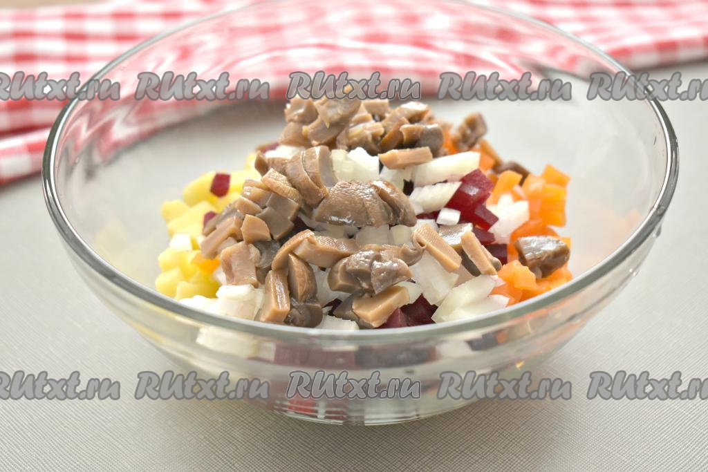 Добавляем маринованные грибы, нарезанные на маленькие кусочки, в миску с винегретом.