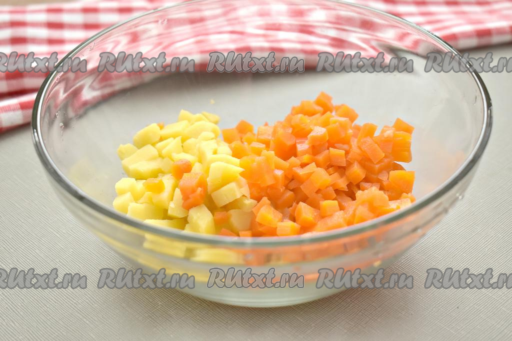 Варёные картошку и морковь нарезаем на маленькие кубики, перекладываем в салатник.