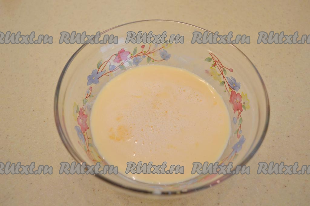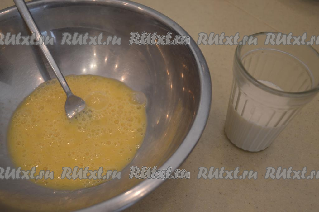 Вилкой интенсивно размешать яйца до однородного состояния (перемешивать в течение 1-1,5 минут). Взбивать яйца до белизны не надо, для омлета яичная масса просто должна стать однородной. Влить молоко и перемешать до однородности омлетную смесь. Молоко обычно добавляется из расчёта: 50 миллилитров молока на 1 яйцо, именно такая пропорция обычно позволяет приготовить вкусный омлет.