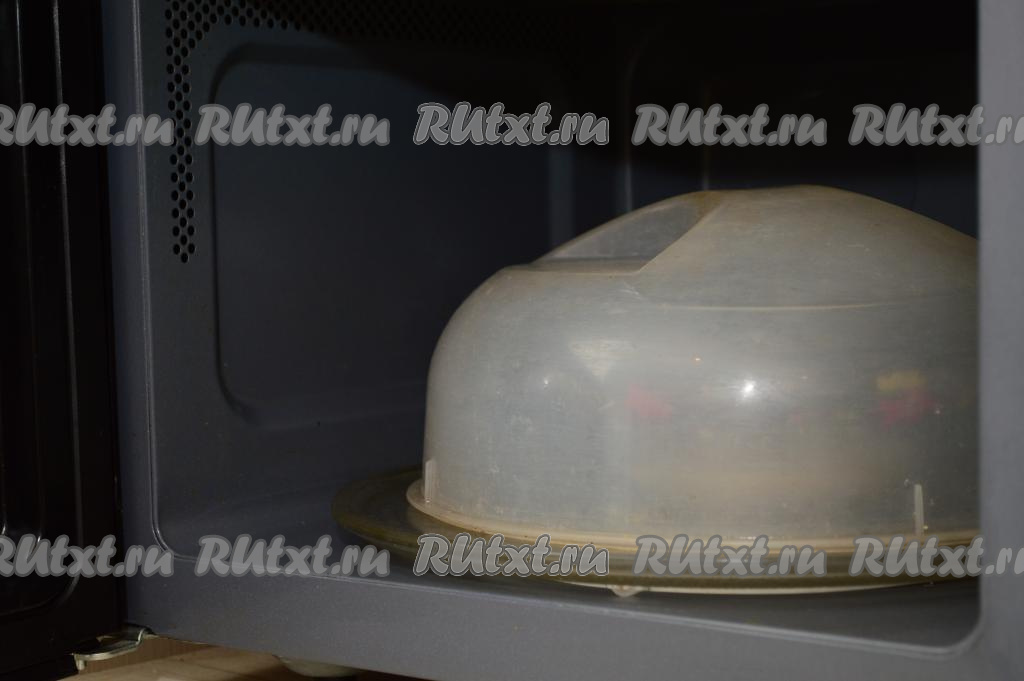 Для того чтобы омлет был паровым, необходимо чтобы он томился на пару, для этого накрываем миску сверху специальной пластиковой крышкой для микроволновок. Если такой крышки нет, то можно миску сверху накрыть тарелкой, пригодной для СВЧ.