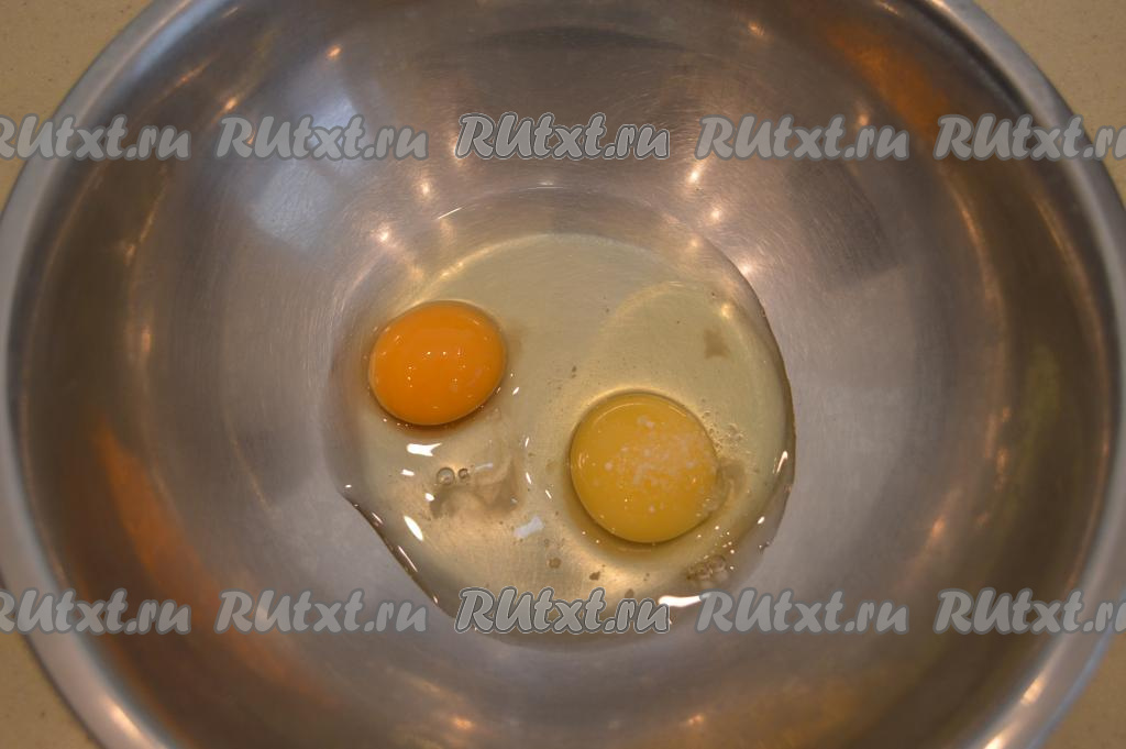 В глубокую миску вбить два сырых яйца. Всыпать 1-2 щепотки соли. Я обычно кладу из расчёта по средней щепотке соли на каждое яйцо.