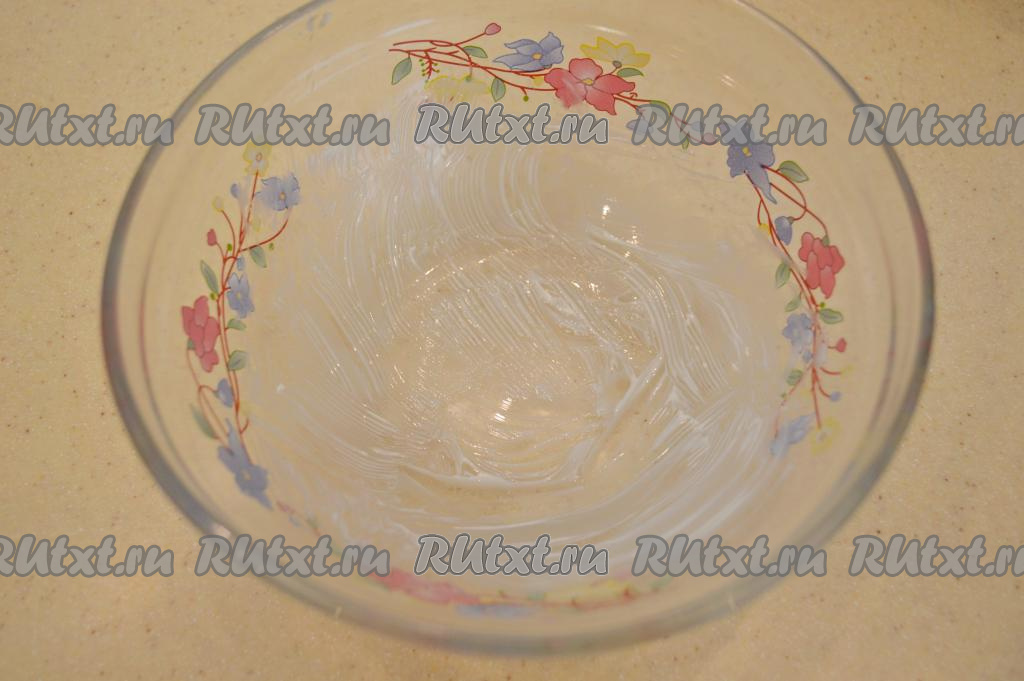 Дно посуды, пригодной для приготовления в микроволновой печи, смазать сливочным маслом. Замечу, что для микроволновки (СВЧ печи) непригодна металлическая посуда и посуда с блестящими элементами декора. У меня для этого существует стеклянная мисочка диаметром 15 сантиметров.