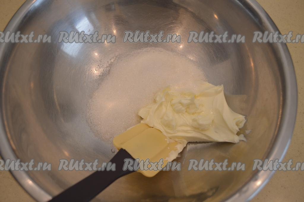 В глубокую миску всыпать сахар и выложить масло, размягчившееся при комнатной температуре.