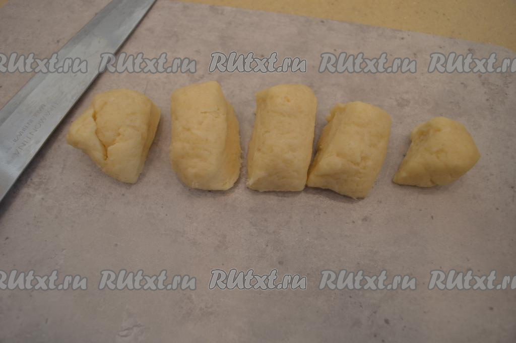 Каждую часть скатать в колбаску, которую разделить ножом на 5 равных частей (в результате из замешанного теста у нас получится 20 заготовок печенья).