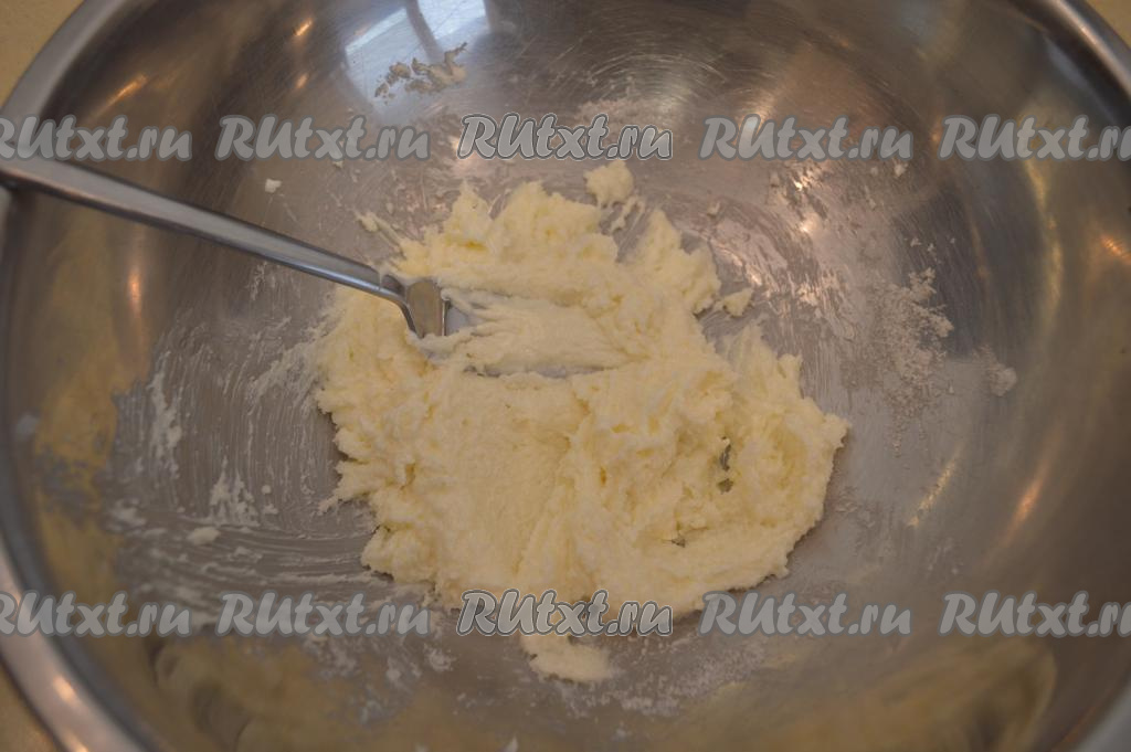 При помощи вилки растереть масло и сахар до получения однородной смеси.