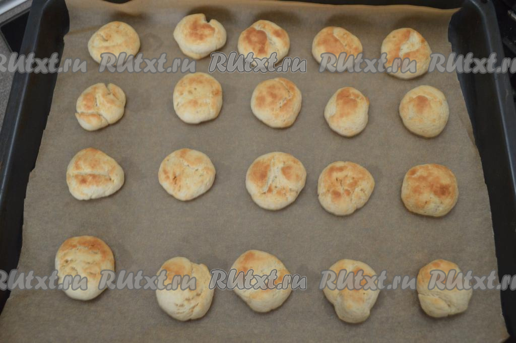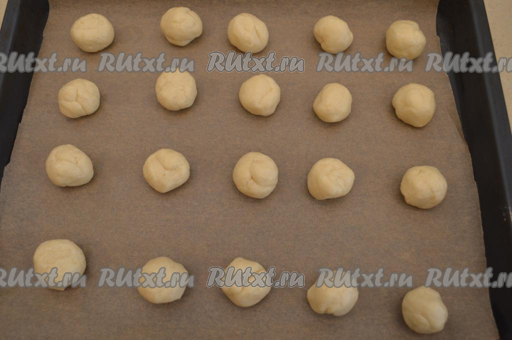 Руками из каждого кусочка скатать шарик. Сформированные шарики выкладывать на небольшом расстоянии друг от друга на противень, застеленный пергаментом.