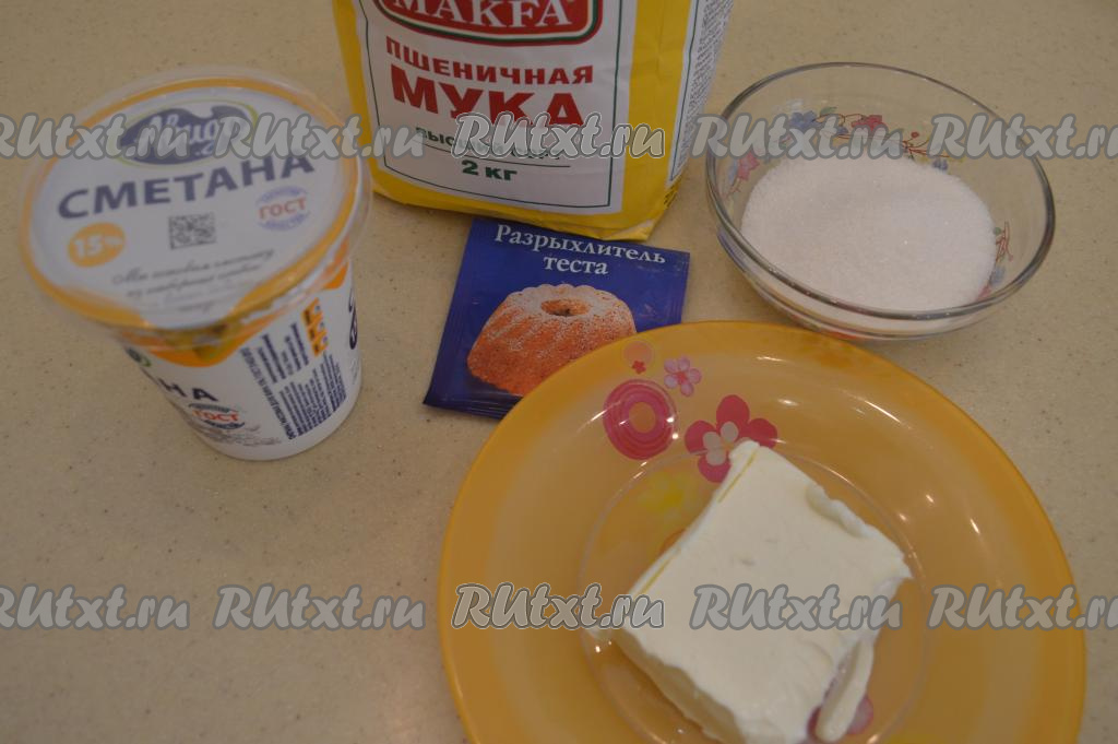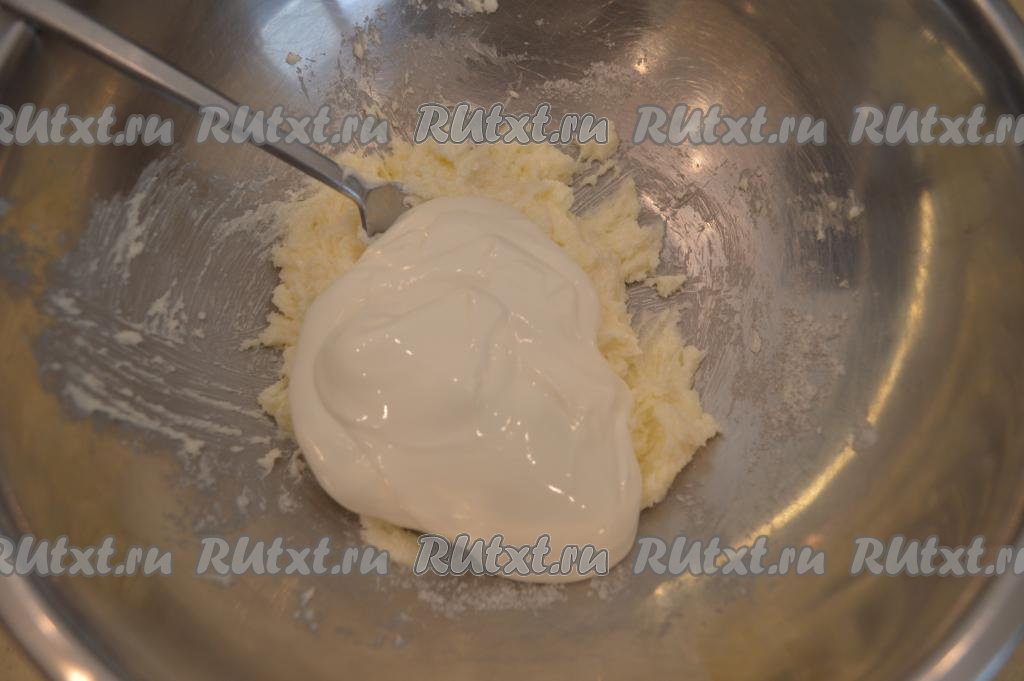 К масляно-сметанной смеси добавить разрыхлитель, частями начать всыпать муку, вмешивая её в тесто сначала ложкой, а затем - руками. Постепенно замесить нежное, приятное в работе, не липнущее к ладоням тесто. Замешивается тесто очень быстро, долго вымешивать его не нужно, как только тесто перестаёт липнуть к рукам, но при этом остаётся мягким, значит больше вымешивать его не нужно. Сформировать из замешанного теста шар.
