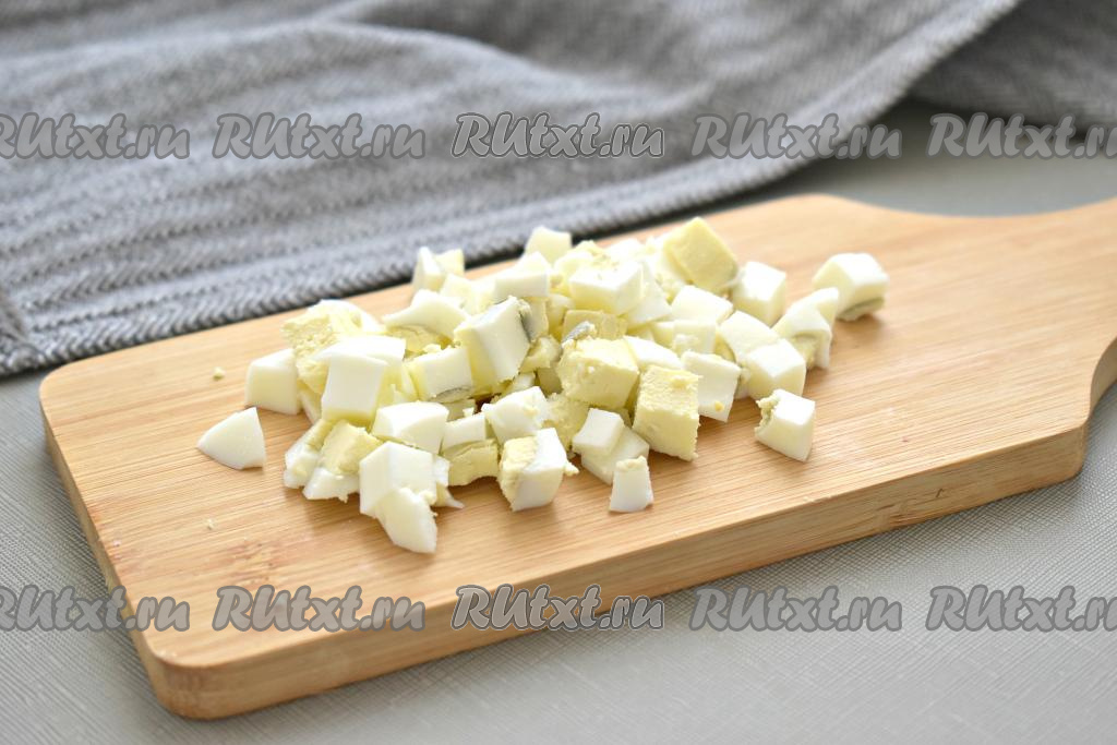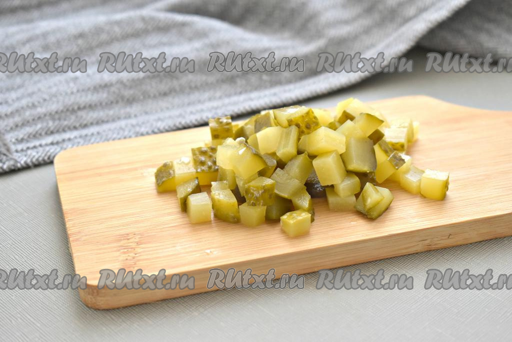 Вымытые картошку и морковку, не очищая от кожуры, перекладываем в небольшую кастрюльку, заливаем овощи полностью водой и ставим на сильный огонь, после закипания варим на небольшом огне минут 20-25 (готовые овощи должны легко прокалываться ножом или вилкой), воду сливаем, даём остыть. Яйца отвариваем с момента закипания воды в течение 10 минут, затем охлаждаем их в холодной воде и очищаем. Картофель и морковь очищаем непосредственно перед приготовлением салата. Варёную картошку нарезаем на небольшие кубики. Все последующие ингредиенты для салата "Столичный", которые мы будем нарезать, должны быть нарезаны на кубики такого же размера, как нарезана картошка.