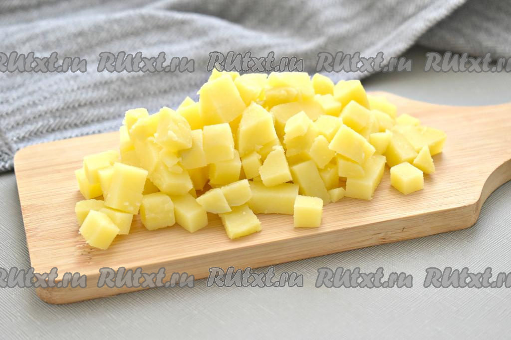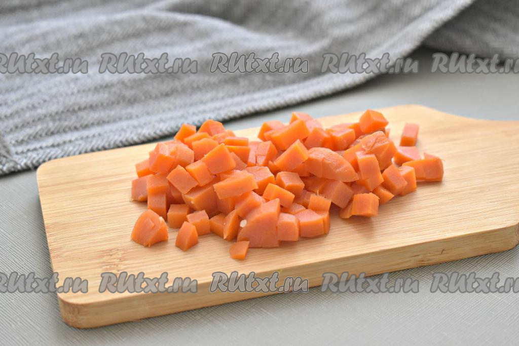 Морковку нарезаем на кубики такого же размера, как нарезана картошка.