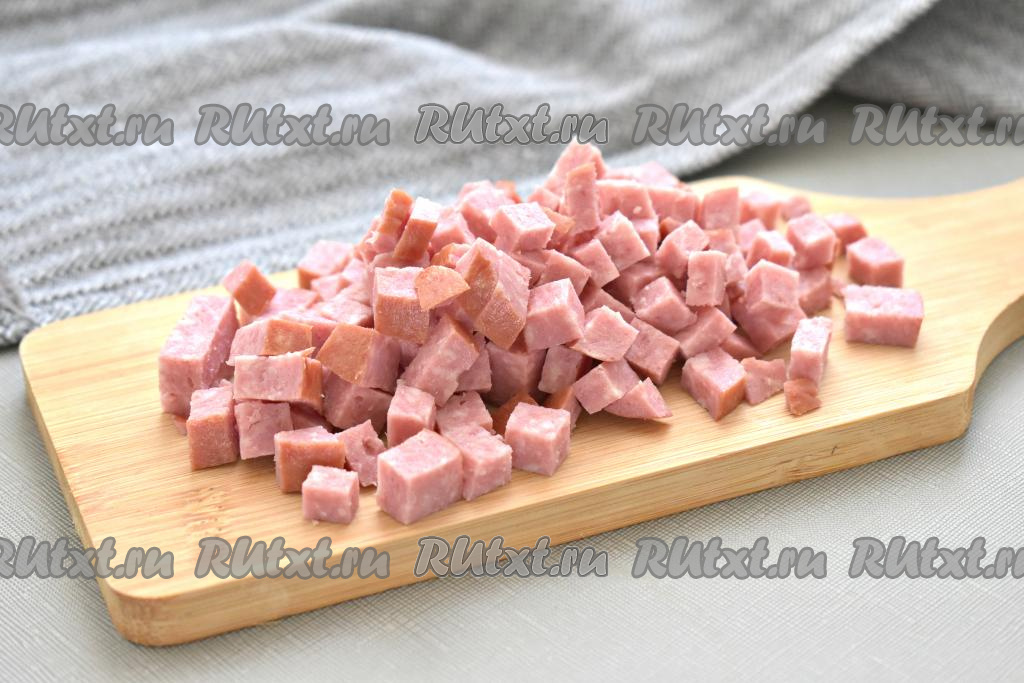 Удаляем с копчёной колбасы шкурку. Нарезаем колбаску на небольшие кубики.